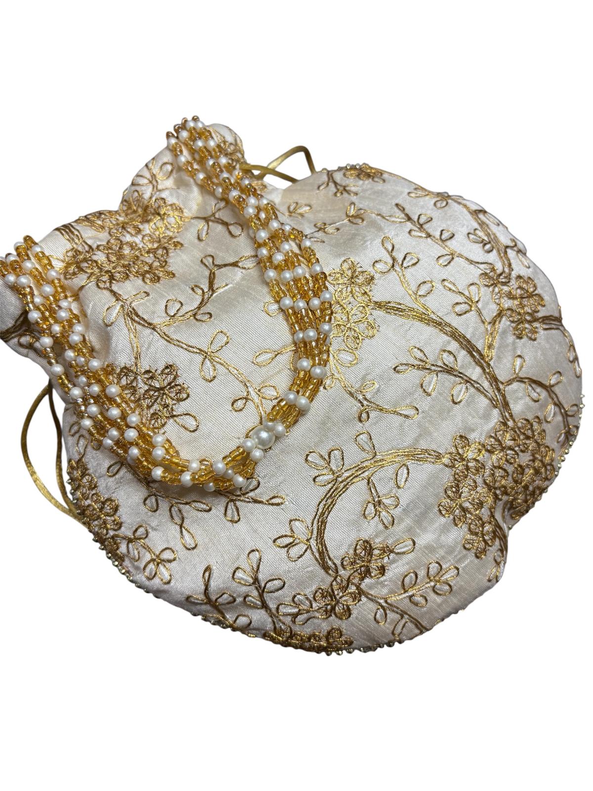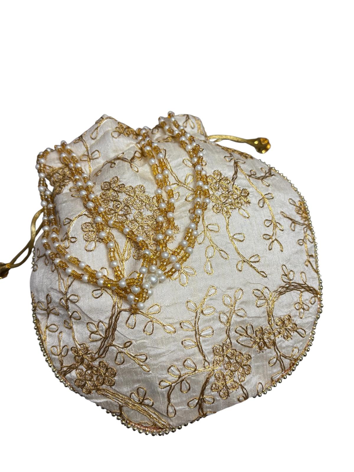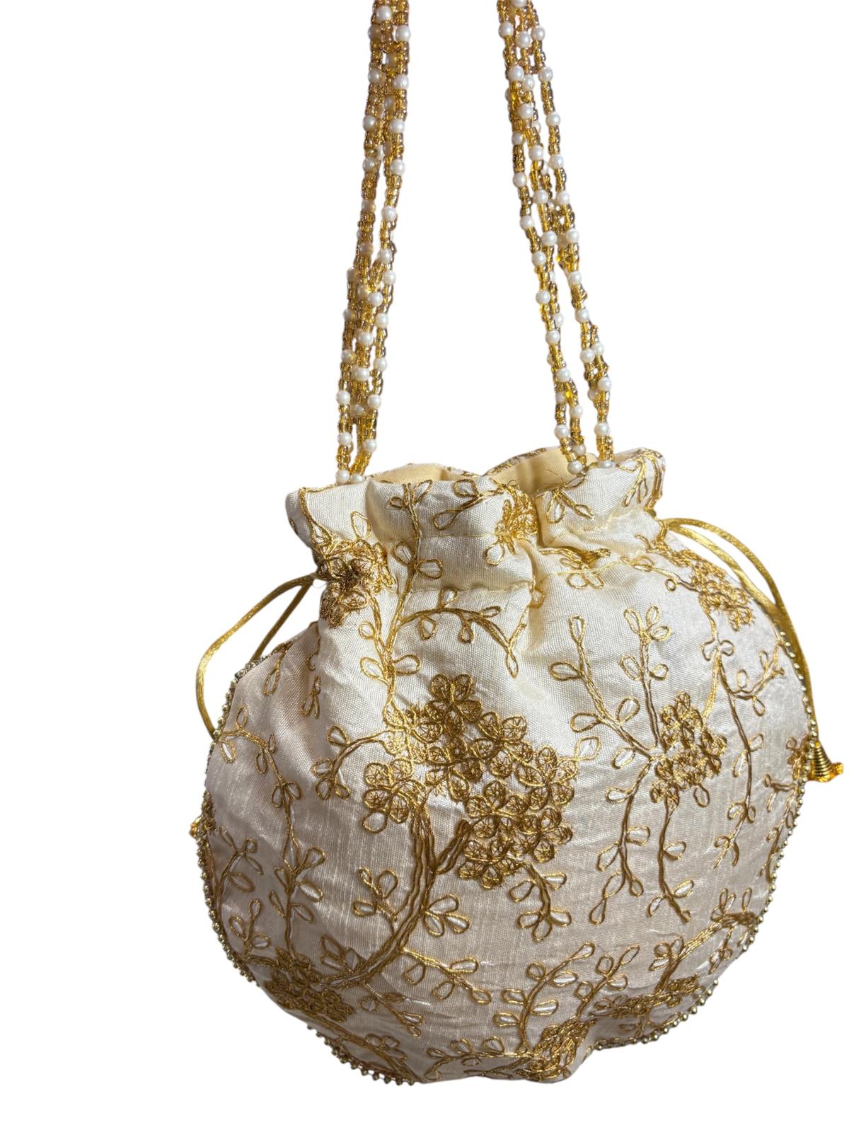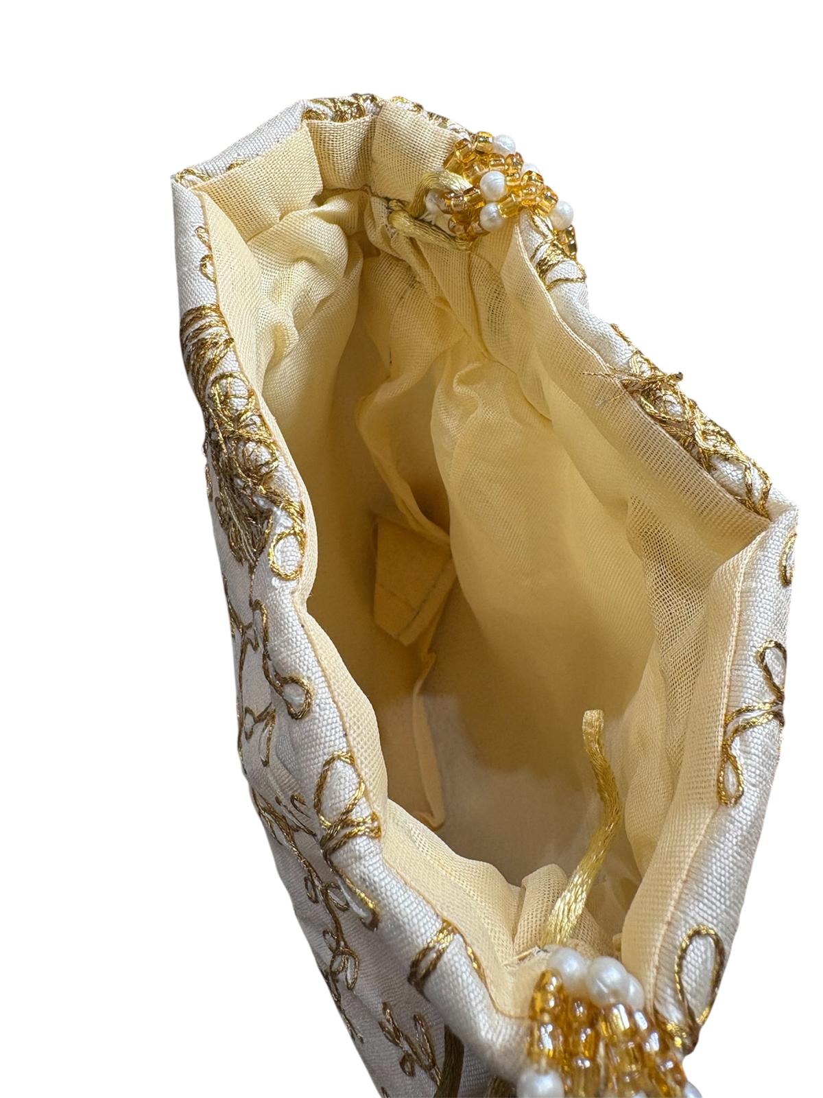 pequeño bolso étnico Indio elegante, bordado con asa corta hecha de perlas. es ligera ideal para destacar en cualquier evento , hermoso bordado tonos dorados base crudo .