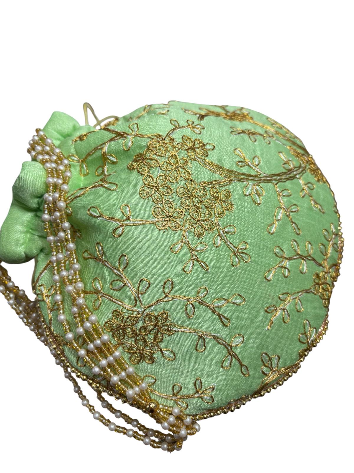 pequeño bolso étnico Indio elegante, bordado con asa corta hecha de perlas. es ligera ideal para destacar en cualquier evento , hermoso bordado tonos dorados base verde claro .